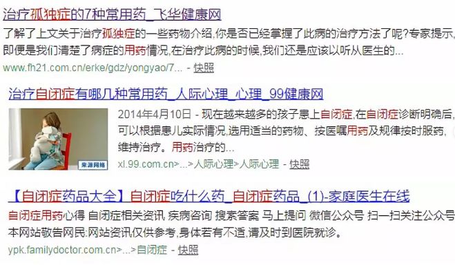 以“自閉癥+用藥”作為關(guān)鍵詞在網(wǎng)站上搜索,排在前面的大多是: