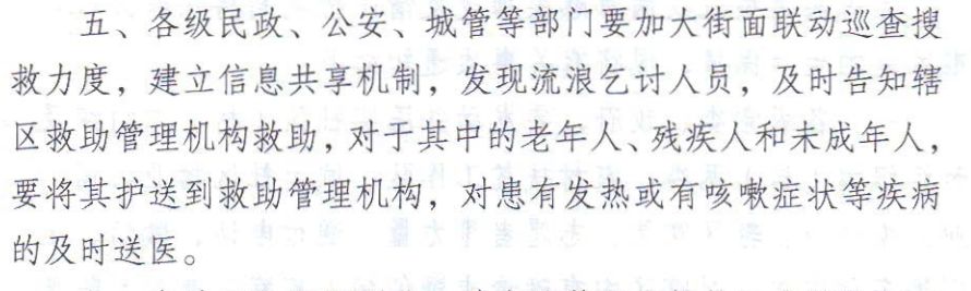 2月14日,民政部發(fā)布《生活無著的流浪乞討人員救助管理機(jī)構(gòu)新冠肺炎疫情防控工作指南》,要求疫情防控期間,對(duì)精神障礙患者、危重病人等在定點(diǎn)醫(yī)院等合作醫(yī)療機(jī)構(gòu)救治、康復(fù)的受助人員,送醫(yī)救治的民政部門和救助管理機(jī)構(gòu),要監(jiān)督合作醫(yī)療機(jī)構(gòu)做好新冠肺炎的防控、診斷、治療等相關(guān)工作,要每日調(diào)度了解在合作醫(yī)療機(jī)構(gòu)救治、康復(fù)人員身體健康狀況。